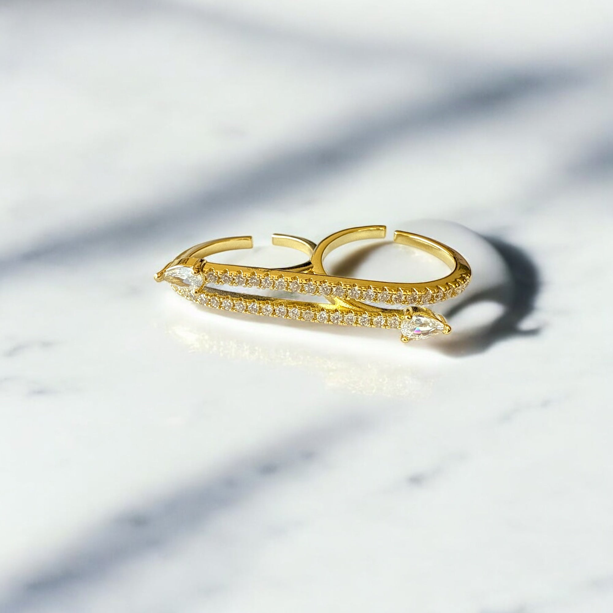 Este anillo doble dorado combina elegancia y modernidad en una sola pieza. Fabricado en acero inoxidable chapado en oro, es resistente y mantiene su brillo impecable. Sus circones blancos reflejan la luz de manera espectacular, agregando un toque sofisticado a cualquier look.