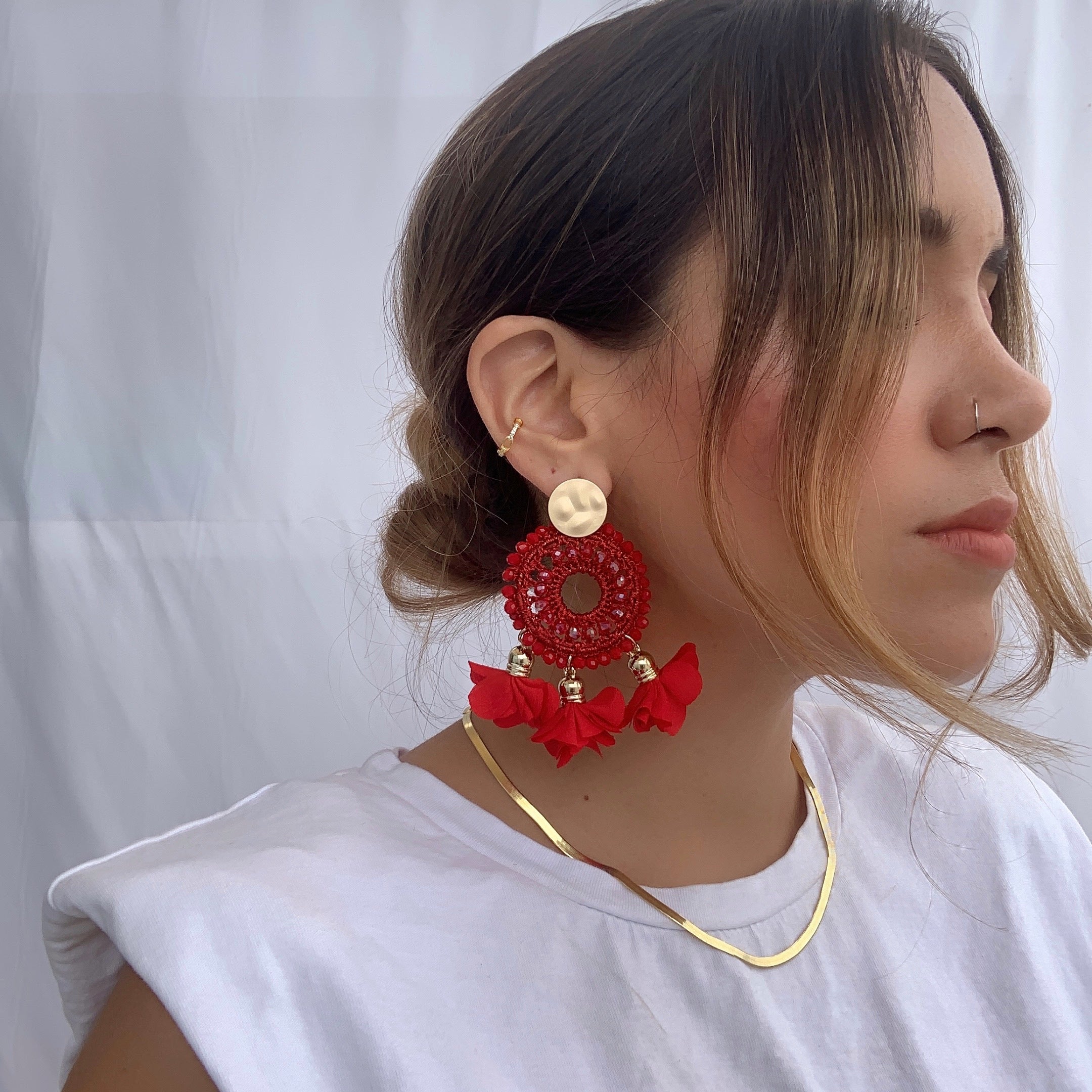 Lindos aretes de aro bordado y flores textiles colgando.