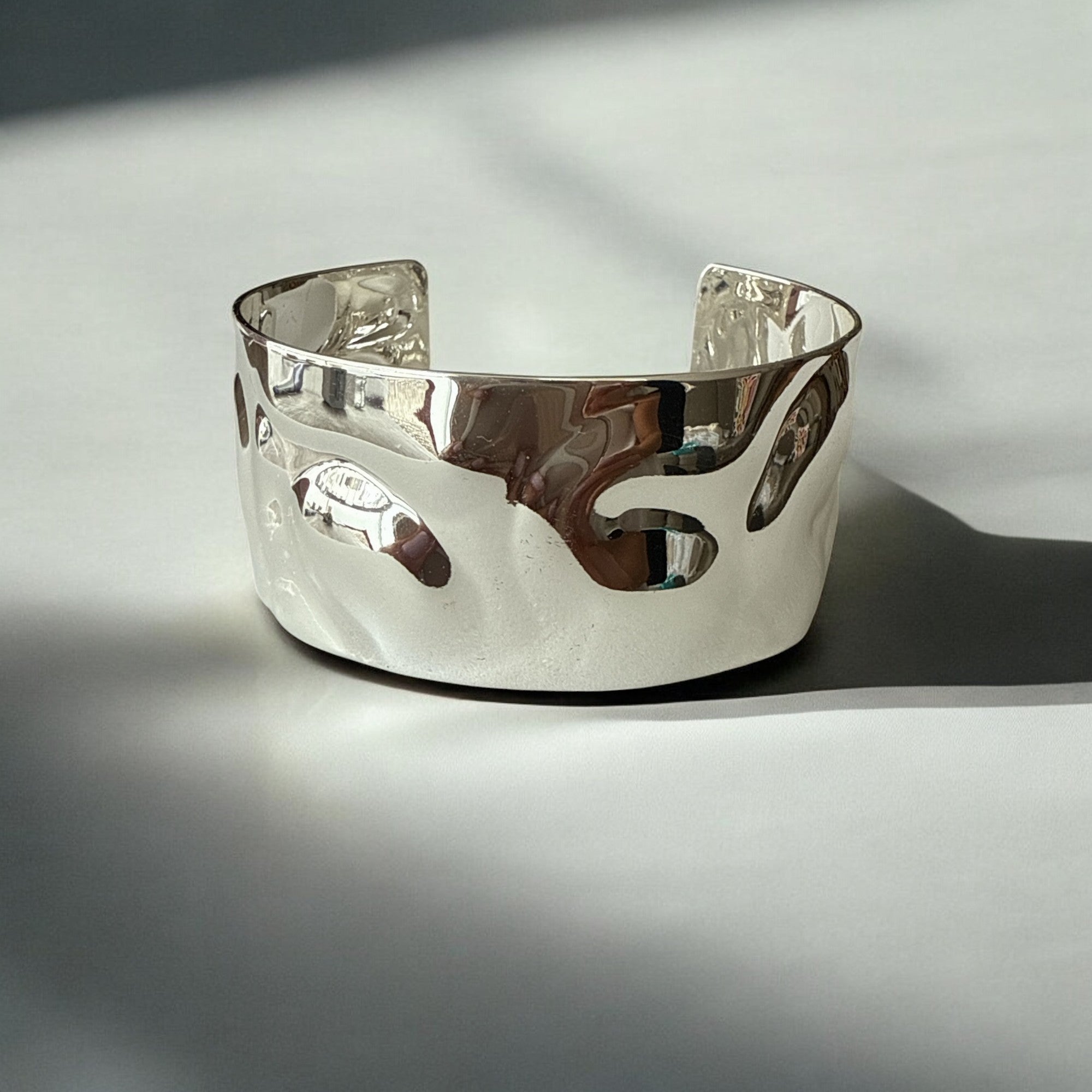 Este brazalete texturizado en acero inoxidable plateado es una joya única y moderna diseñada para destacar en cualquier look. Su superficie texturizada con un diseño desigual y su acabado en tono plateado brillante le otorgan un toque audaz y elegante. Ideal para complementar estilos contemporáneos o darle un toque especial a looks minimalistas.