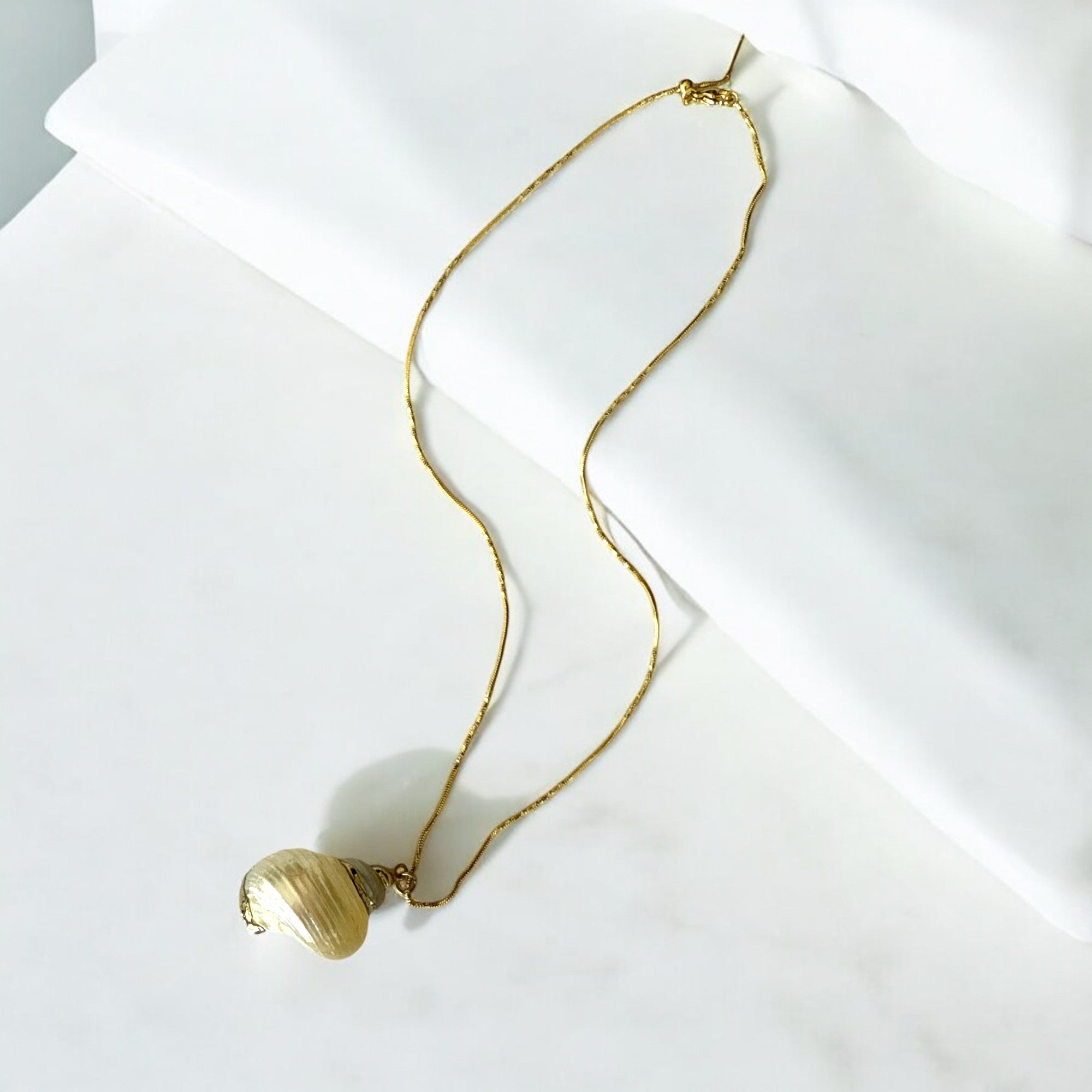 Este exclusivo collar fusiona la delicadeza de una caracola natural nacarada con la elegancia del baño de oro, resaltando su textura y brillo único. Su cadena tipo serpiente, de 1 mm de espesor y 46 cm de largo, aporta un toque sutil y sofisticado que realza la pieza.