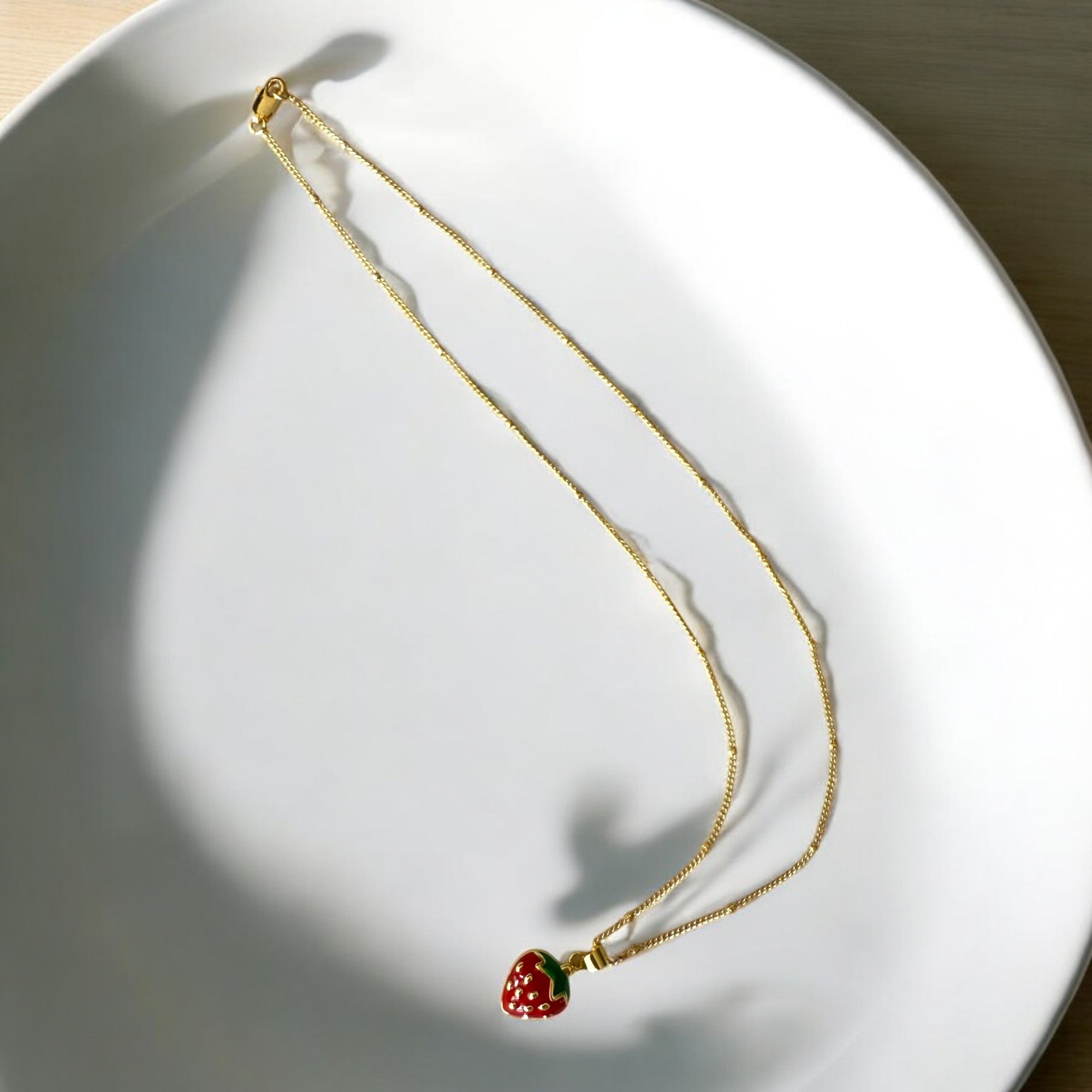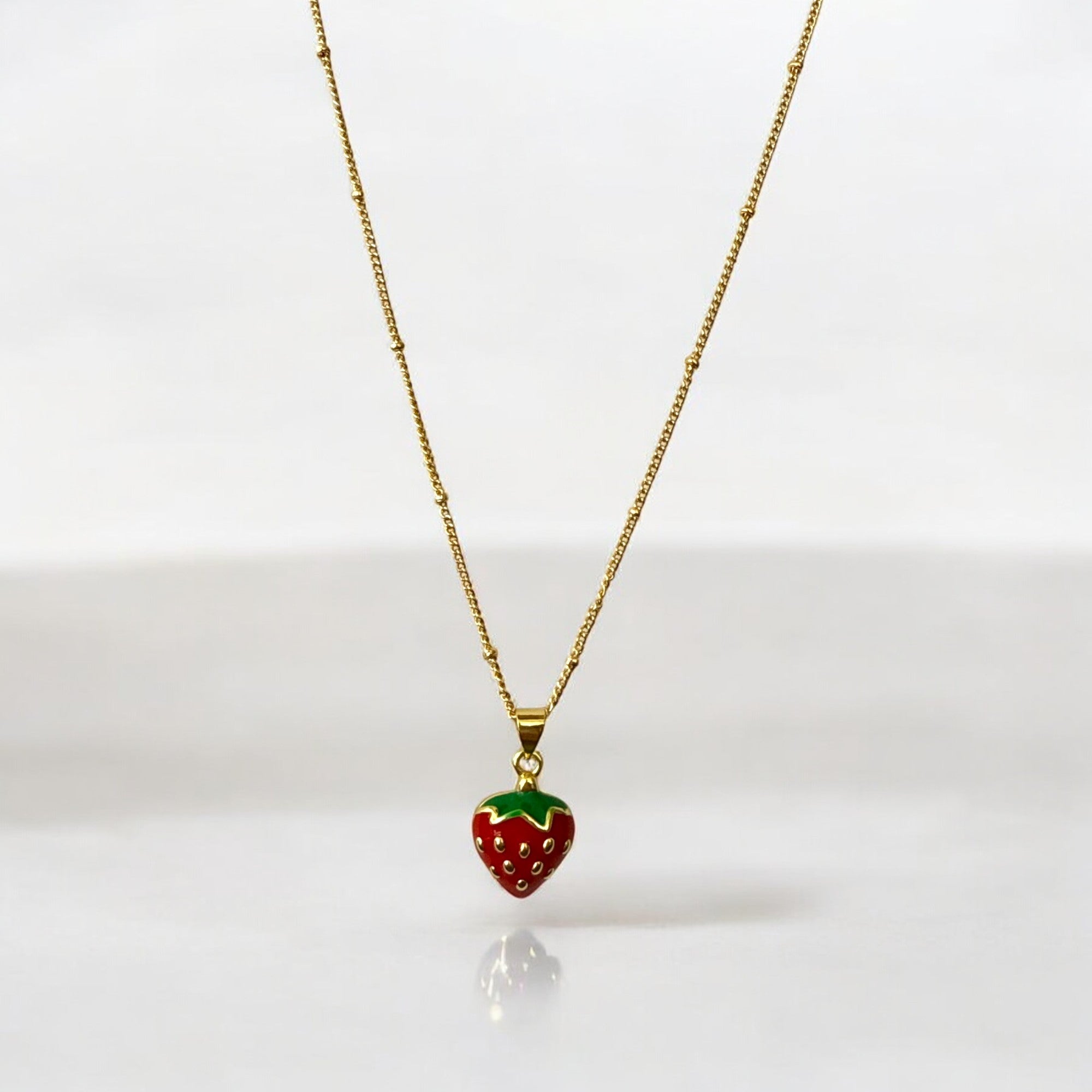 Este encantador collar está elaborado en acero bañado en oro y cuenta con un dije de fresa esmaltado en colores vibrantes, realzado con detalles brillantes. Su cadena fina de 1 mm de grosor y 44 cm de largo abierta lo convierte en un accesorio versátil, delicado y moderno, ideal para quienes aman los diseños divertidos y elegantes.