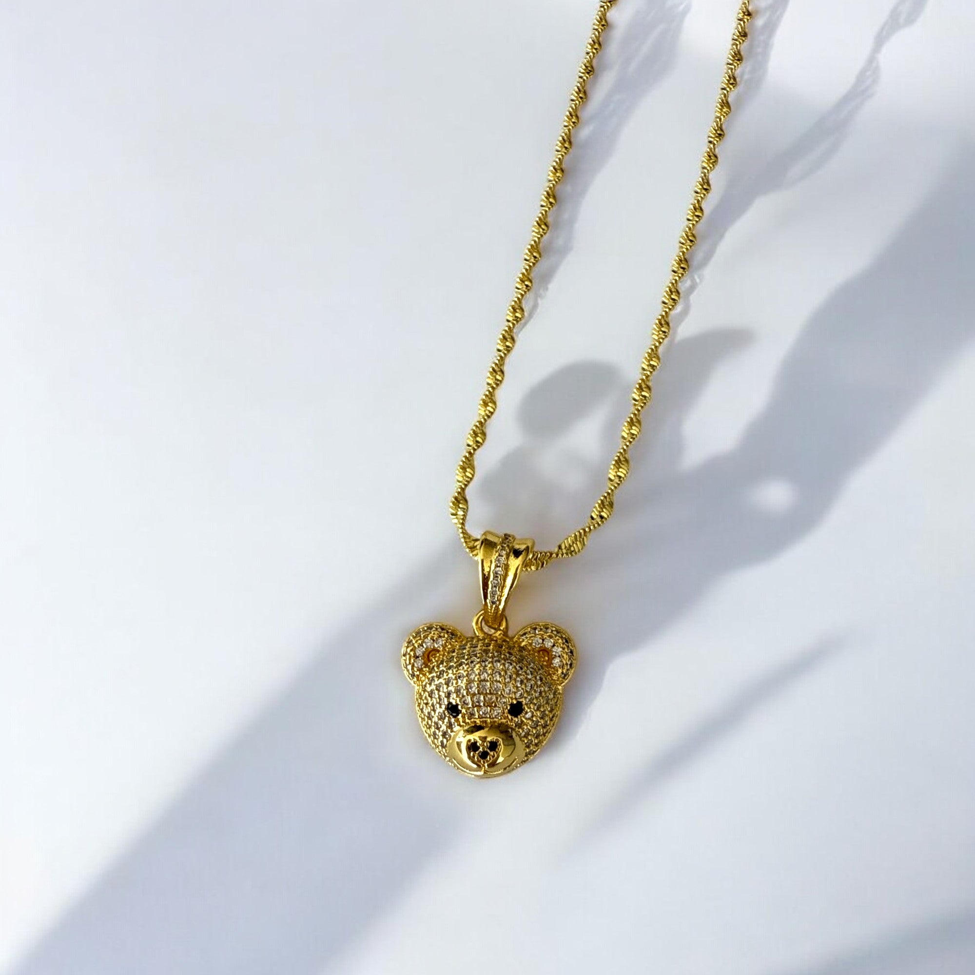 Este hermoso collar está elaborado en acero bañado en oro y presenta un dije de oso de 2.5 x 2.5 cm, con un diseño en relieve cubierto de circones brillantes que le dan un acabado lujoso y llamativo. La cadena rope de 2 mm le añade un toque de textura y elegancia, perfecta para realzar cualquier look.