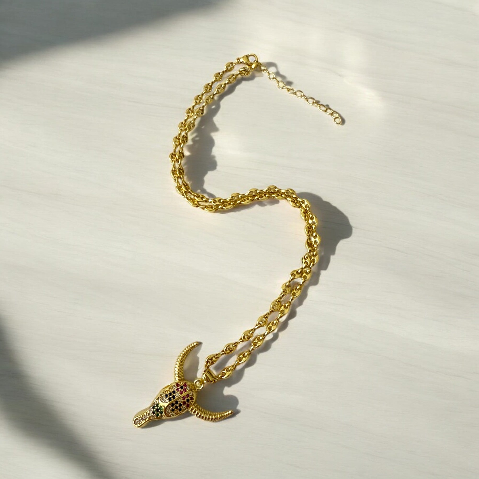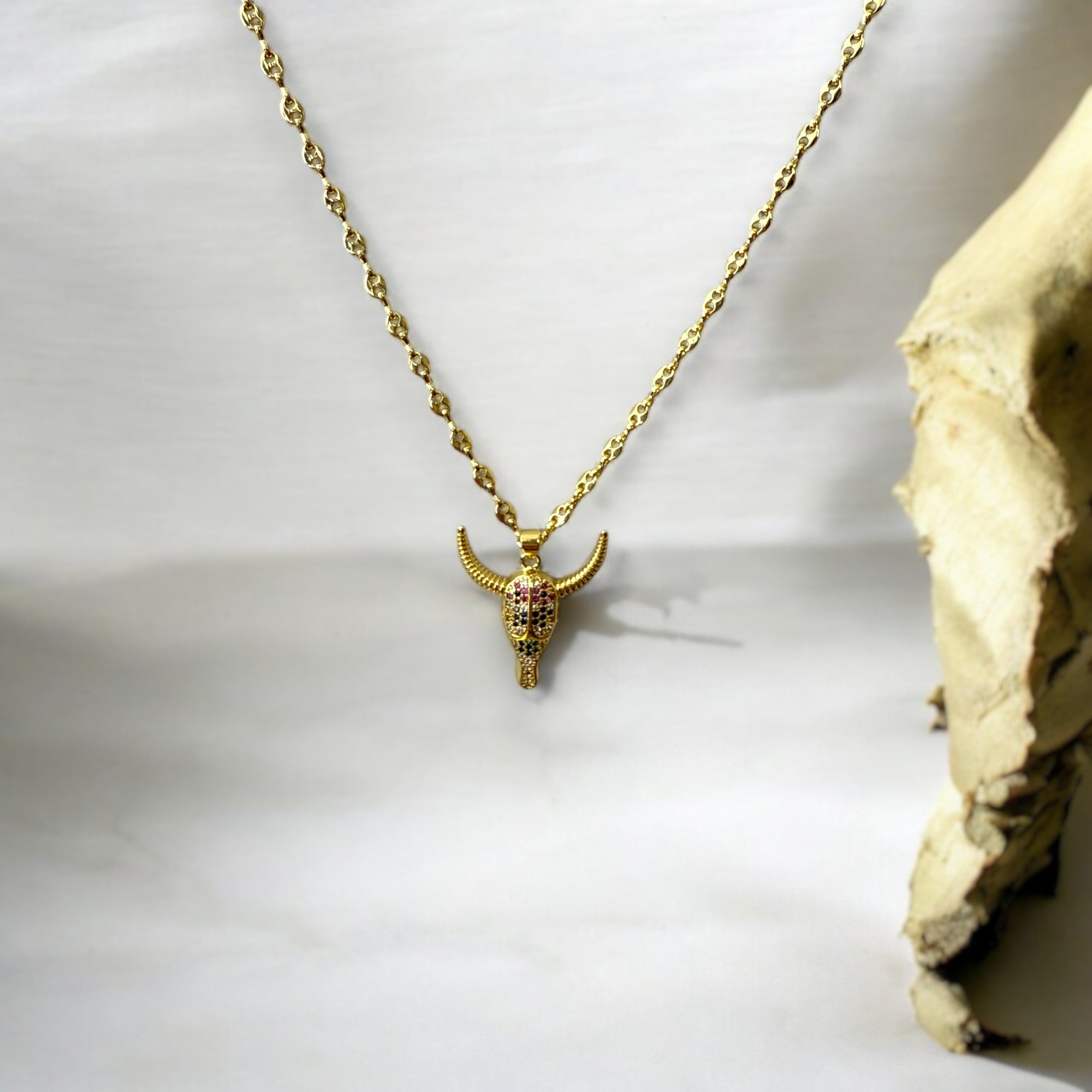 Este impresionante collar combina la resistencia del acero bañado en oro con el impacto visual de un dije de toro Longhorn con circones de colores, reflejando poder, determinación y estilo.