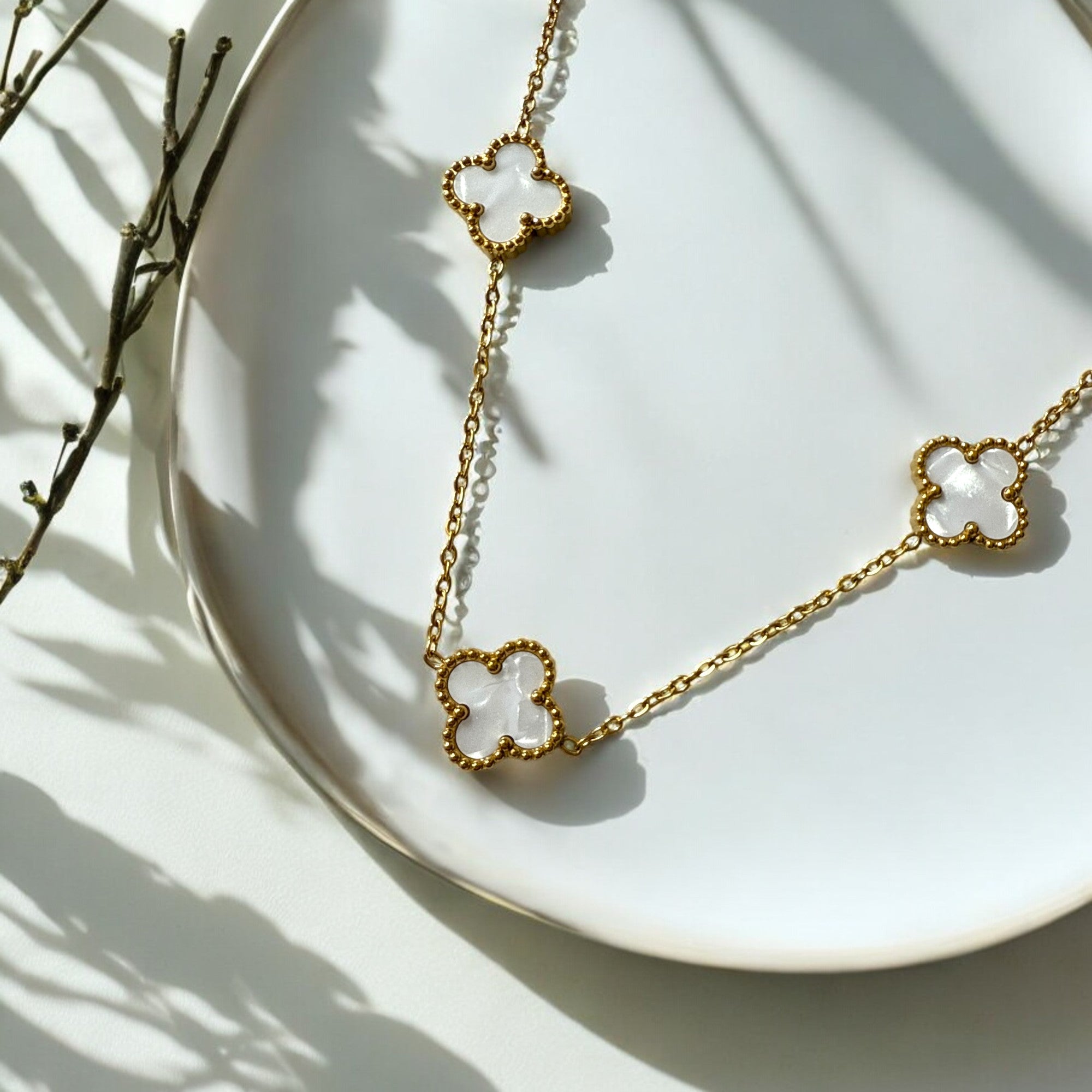 Este hermoso collar de acero inoxidable presenta cinco tréboles blancos esmaltados, un diseño sofisticado que aporta un toque refinado y minimalista. Su color neutro lo hace fácil de combinar con cualquier outfit, desde looks casuales hasta atuendos más elegantes. Con un largo de 40 cm más 5.5 cm de extensión, es ideal para quienes buscan un accesorio versátil y con un acabado impecable.