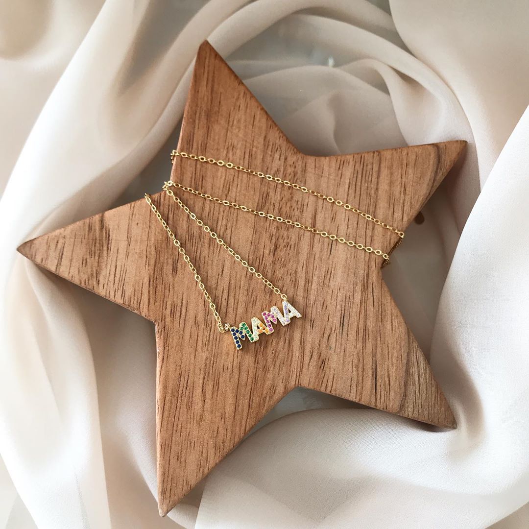 Lindo y delicado collar en plata 925 con baño en oro con la palabra MAMÁ en circones de colores.