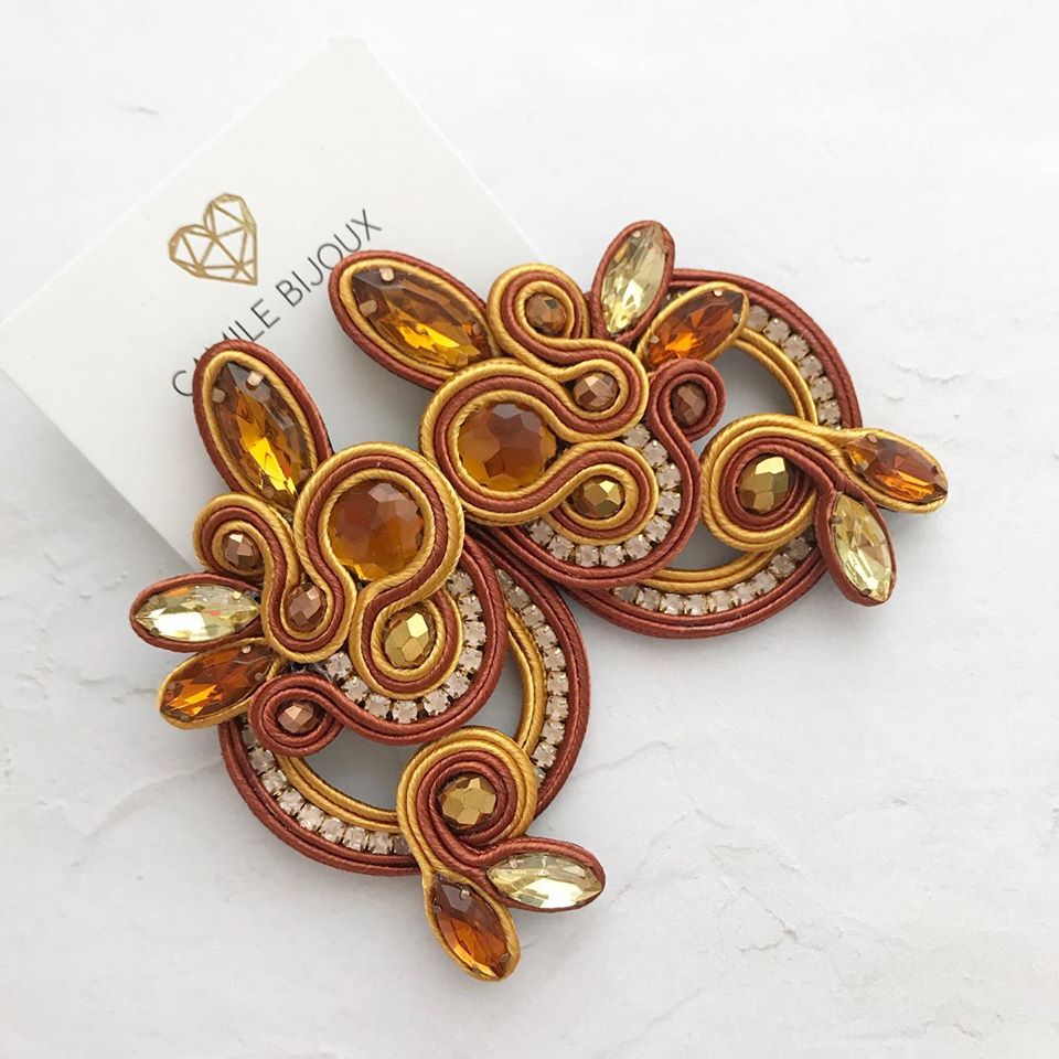 Lindoa aretes hechos con la técnica de soutache. Con pedrería fina y pin de fantasía. Largo:8,5cm