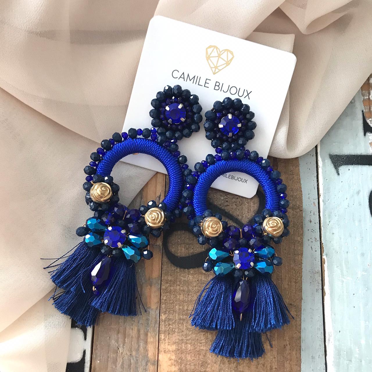 Bellos aretes 100% hechos a mano con la técnica del bordado y macramé. Largo: 10cm Pin de fantasía Todos nuestros accesorios vienen en un empaque de tela y bolsita de papel perfectos para regalar.