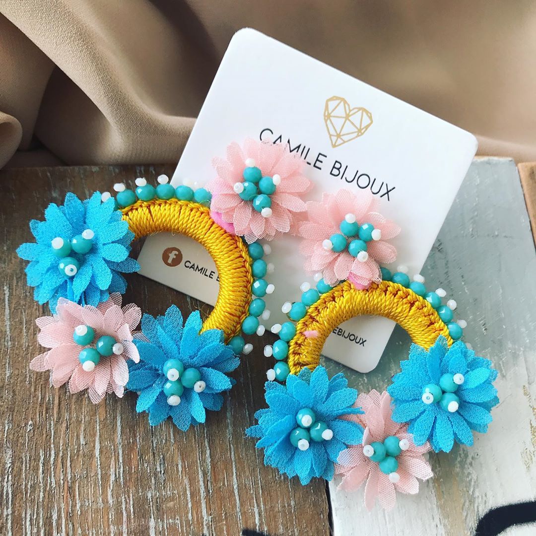 Bellos y ultra livianos aretes bordados a mano con delicadas flores de tela que aportarán ese toque especial que tu look necesita. Úsalos de día o de noche. Largo:7cm