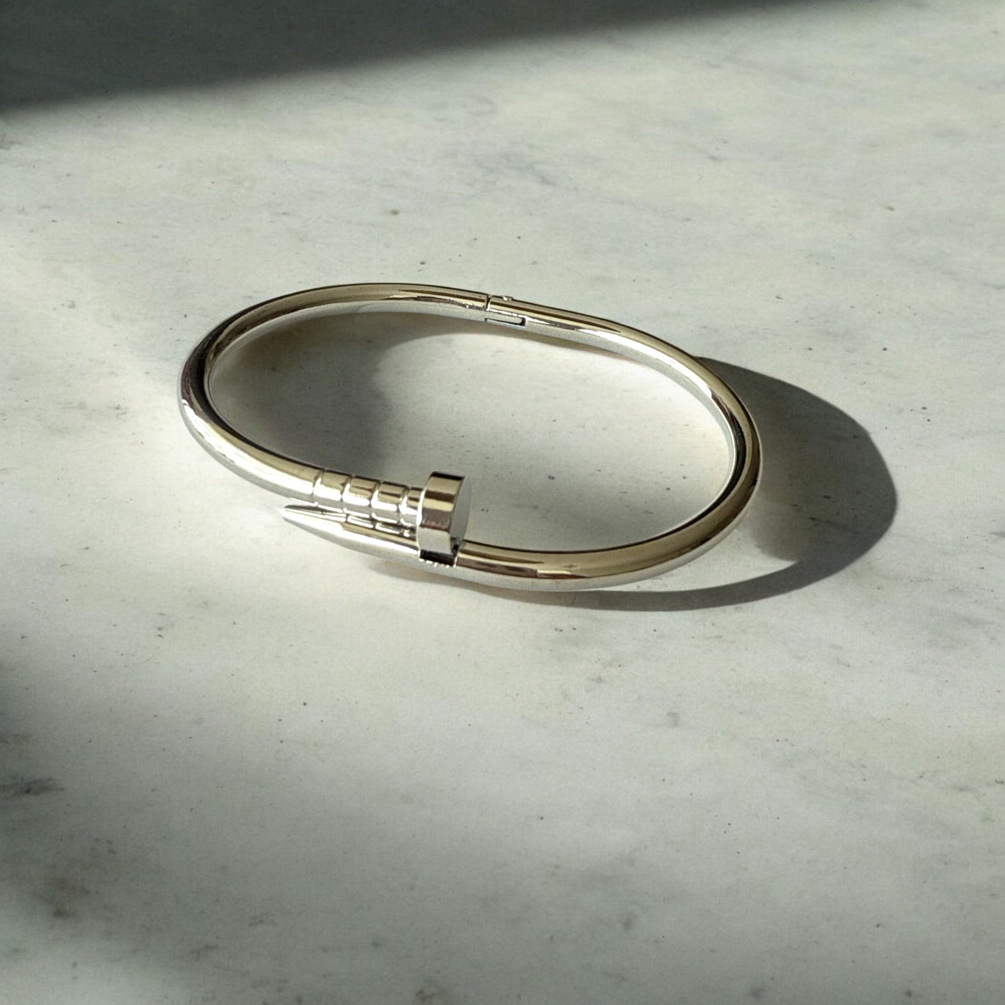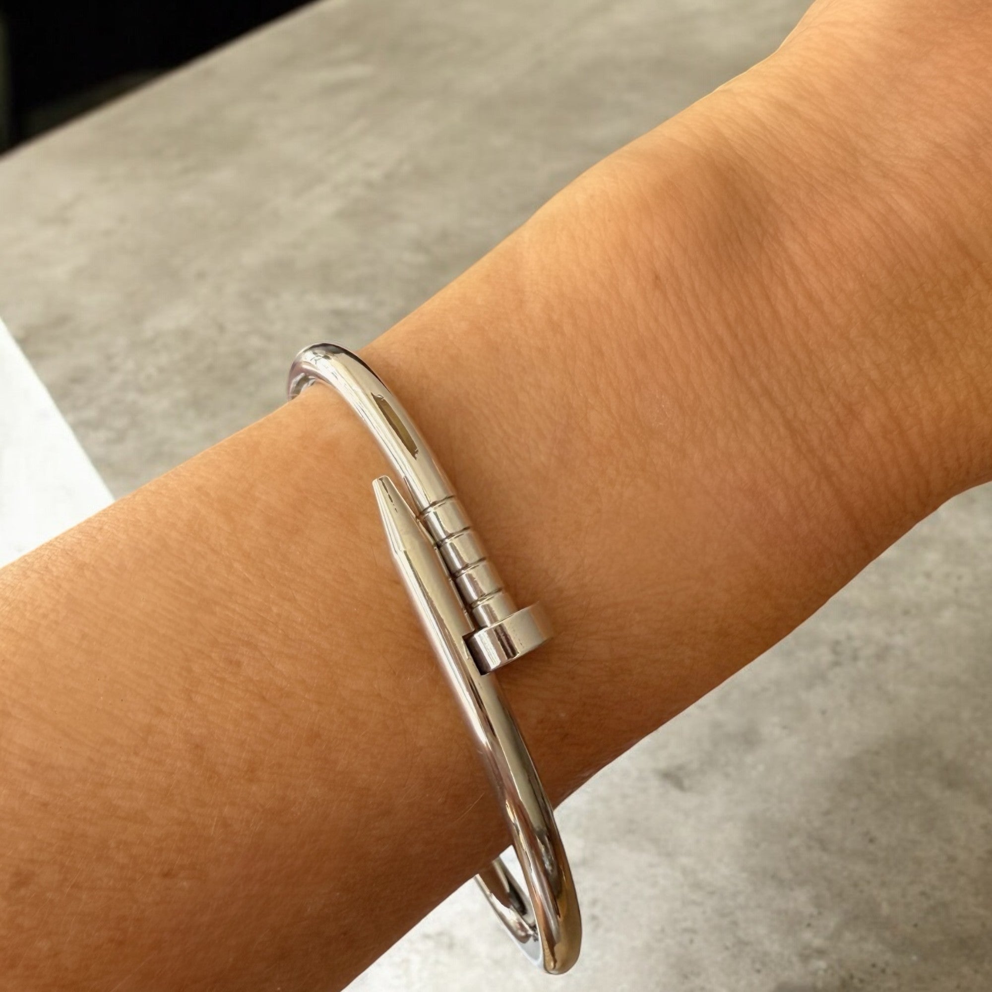 Esta pulsera de acero inoxidable plateado con diseño de clavo es la combinación perfecta entre estilo industrial y elegancia moderna. Su acabado en tono plateado brillante y su forma única inspirada en un clavo la convierten en una pieza versátil para cualquier ocasión. Es ligera, cómoda y resistente, perfecta para quienes buscan un accesorio moderno y duradero.